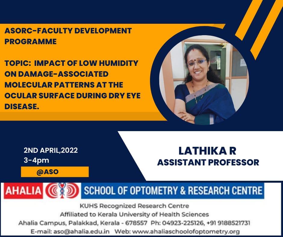 Our Faculty Mrs.Lathika R gave a talk on “Impact Of Low Humidity On Damage-Associated Molecular Patterns At The Ocular Surface During Dry Eye Disease ” during the Faculty Development Programme conducted at ASORC on 02.04.2022.All the faculties of ASORC participated.