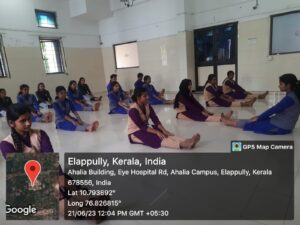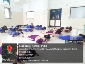 The international Yoga day was conducted by the students union and arts and crafts club on June 21st at 11am to 12 PM the programme was held in lecture hall -4. The program was hosted by Sreelakshmi Pradeep from 2nd yr Bsc Optometry,in presence of facilities Lathika, Athira , Hafeena . Total 20 students participated, 5 students from 1st year, 10 students from 2 nd year, 5 students from 3rd year. We mainly focused on 5 yoga asanas (Pathmasana,nawkasana,vajrasana,vrikshasana,bhujangasana ). The program was successfully conducted.