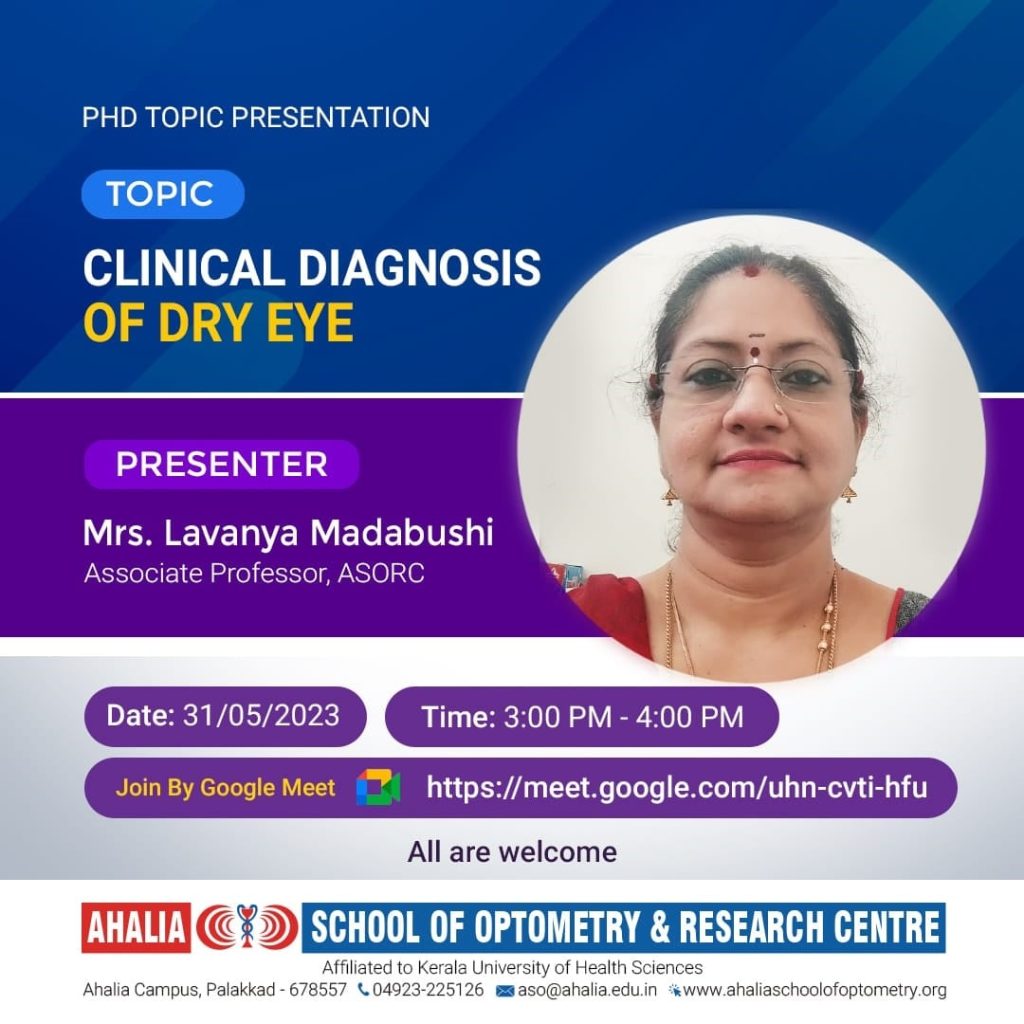 PhD Topic Presentation “Clinical Diagnosis of Dry Eye” The PhD topic presentation of Mrs Lavanya K Associate Professor was conducted on 31.05.2023. By Admin May 31, 2023 News