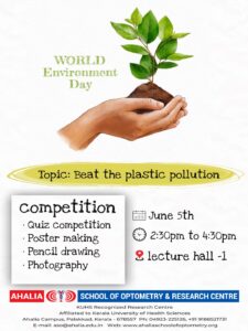 WORLD ENVIRONMENT DAY is June 5. Ahalia School of Optometry students carried out a number of programmes to enhance the beauty of Environmental Day. Students from both UG and PG levels participated in the quiz programmes, which were held in the afternoon session.